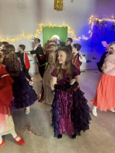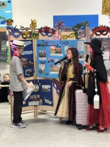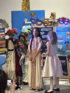 Zwieńczeniem projektu był wyjątkowy bal, podczas którego szkolne korytarze zamieniły się w prawdziwą salę wenecką. Kolorowe stroje, maski, muzyka i radość dzieci stworzyły niezapomniany klimat.